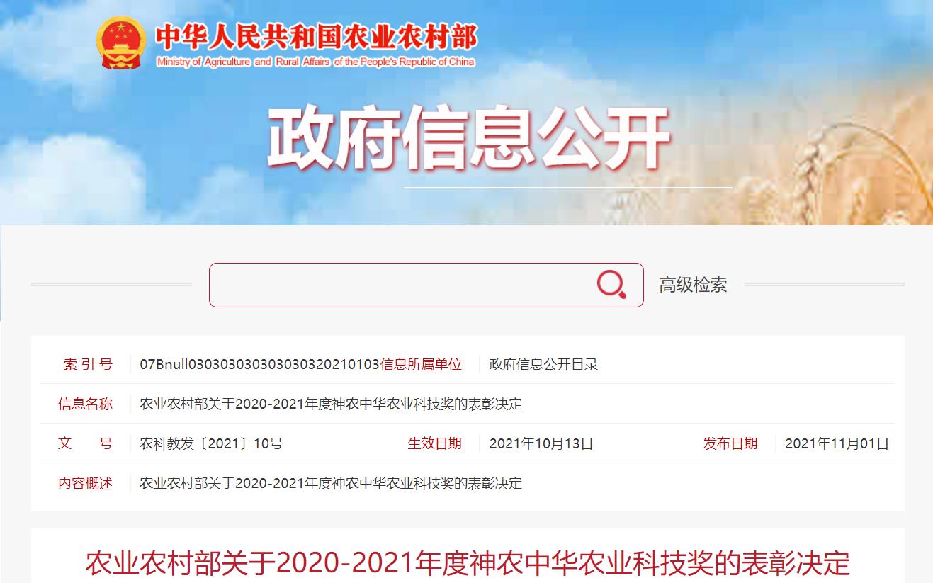 11月1日,农业农村部发布了《农业农村部关于2020-2021年度神农中华农业科技奖的表彰决定》,由中国-九游·会J9官方网站|真人游戏第一品牌 参与的“猪用重组口蹄疫O型、A型二价灭活疫苗的创制与应用”项目,喜获科学研究类成果一等奖。“神农中华农业科技奖”是经农业农村部、科技部批准设立的面向全国农业行业的综合性科学技术奖,旨在表彰为我国农业科技进步和农业农村经济发展作出突出贡献的农业科技人员和创新团队。