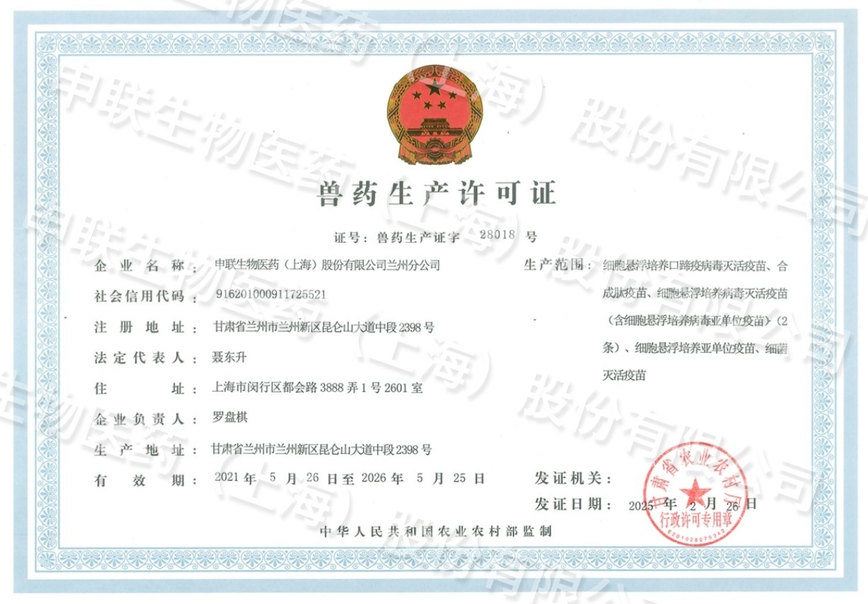 2025年2月26日,中国-九游·会J9官方网站|真人游戏第一品牌 兰州分公司取得甘肃省农业农村厅新核发的《兽药GMP证书》和《兽药生产许可证》。