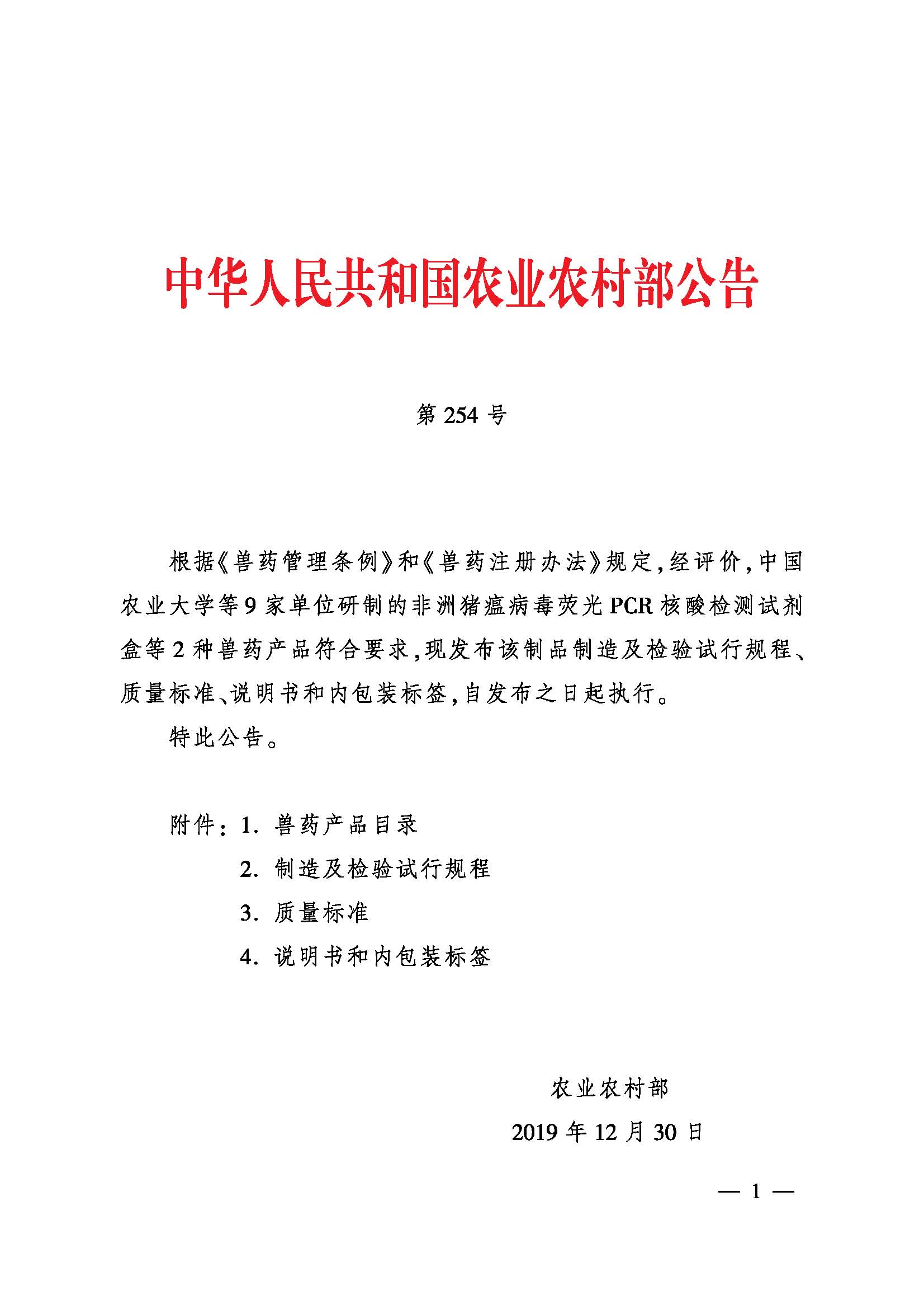 根据农业农村部 2020 年 1 月 10 日发布的第 254 号公告,公司与其他单位联合研制的“非洲猪瘟病毒荧光 PCR 核酸检测试剂盒”兽药产品获得农业农村部批准。