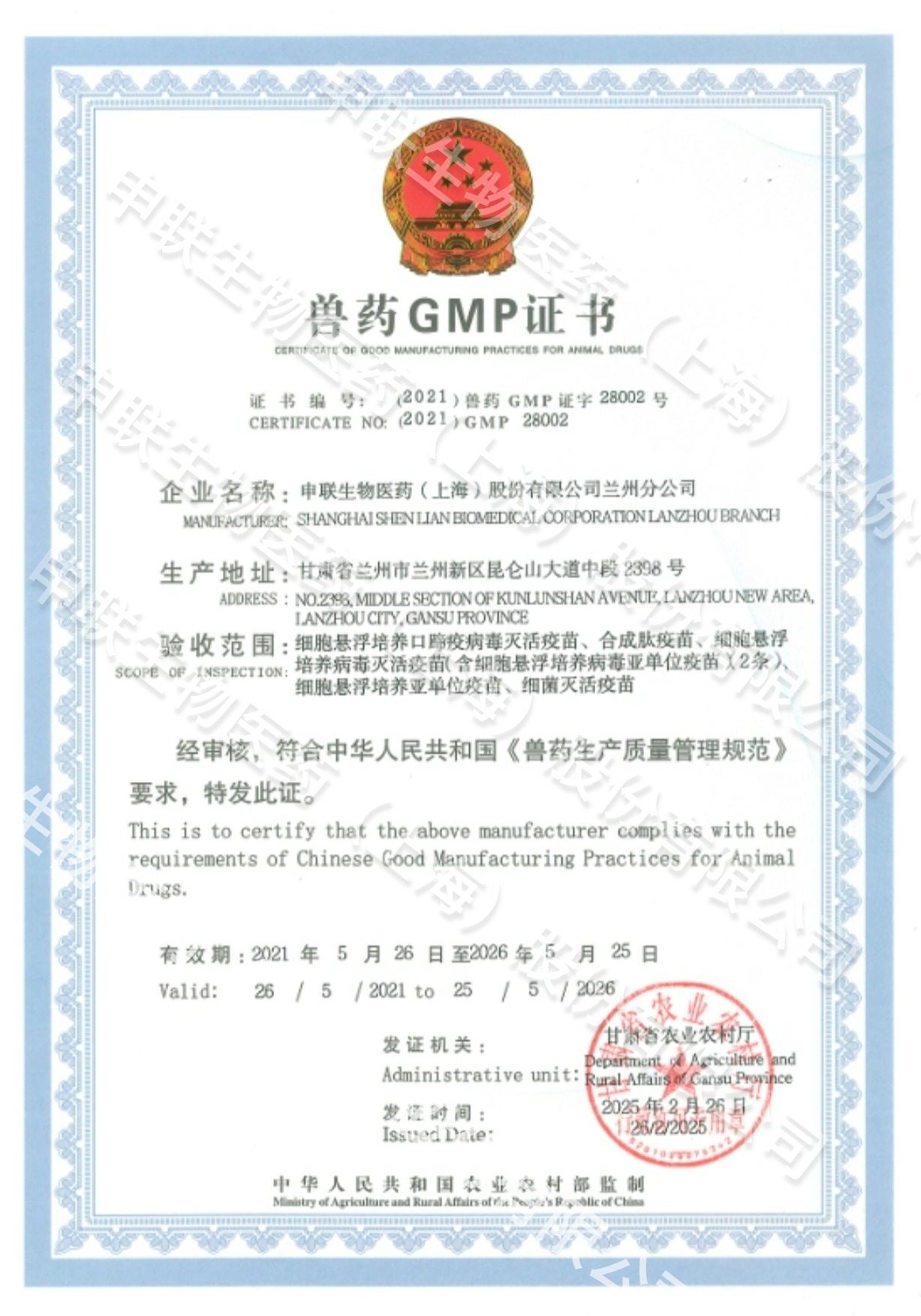至此,公司兰州分公司GMP生产范围包括:(1)细胞悬浮培养口蹄疫病毒灭活疫苗(2)合成肽疫苗(3)细胞悬浮培养病毒灭活疫苗(含细胞悬浮培养病毒亚单位疫苗) 【2条】(4)细胞悬浮培养亚单位疫苗(5)细菌灭活疫苗