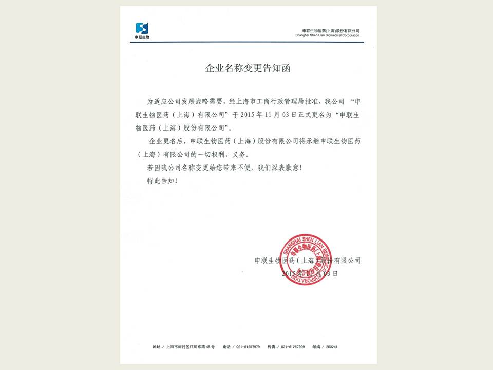 2015年11月03日,为适应公司发展战略需要,“j9九游会官方生物医药(上海)有限公司”正式更名为“中国-九游·会J9官方网站|真人游戏第一品牌 ”。企业更名后,中国-九游·会J9官方网站|真人游戏第一品牌 将继承j9九游会官方生物医药(上海)有限公司的一切权利、义务。