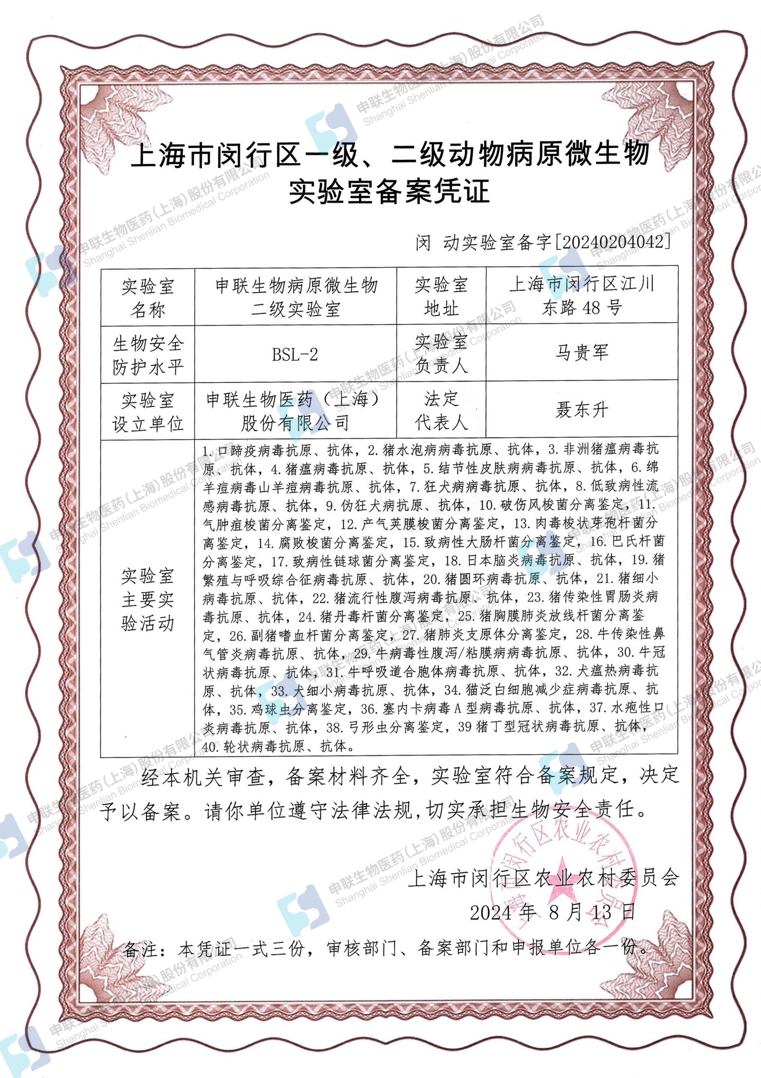 经专家组综合评定,j9九游会官方生物病原微生物实验室通过了现场检查,并于2024年8月13日取得了动物病原微生物生物安全二级 (BSL- 2)实验室备案证书。